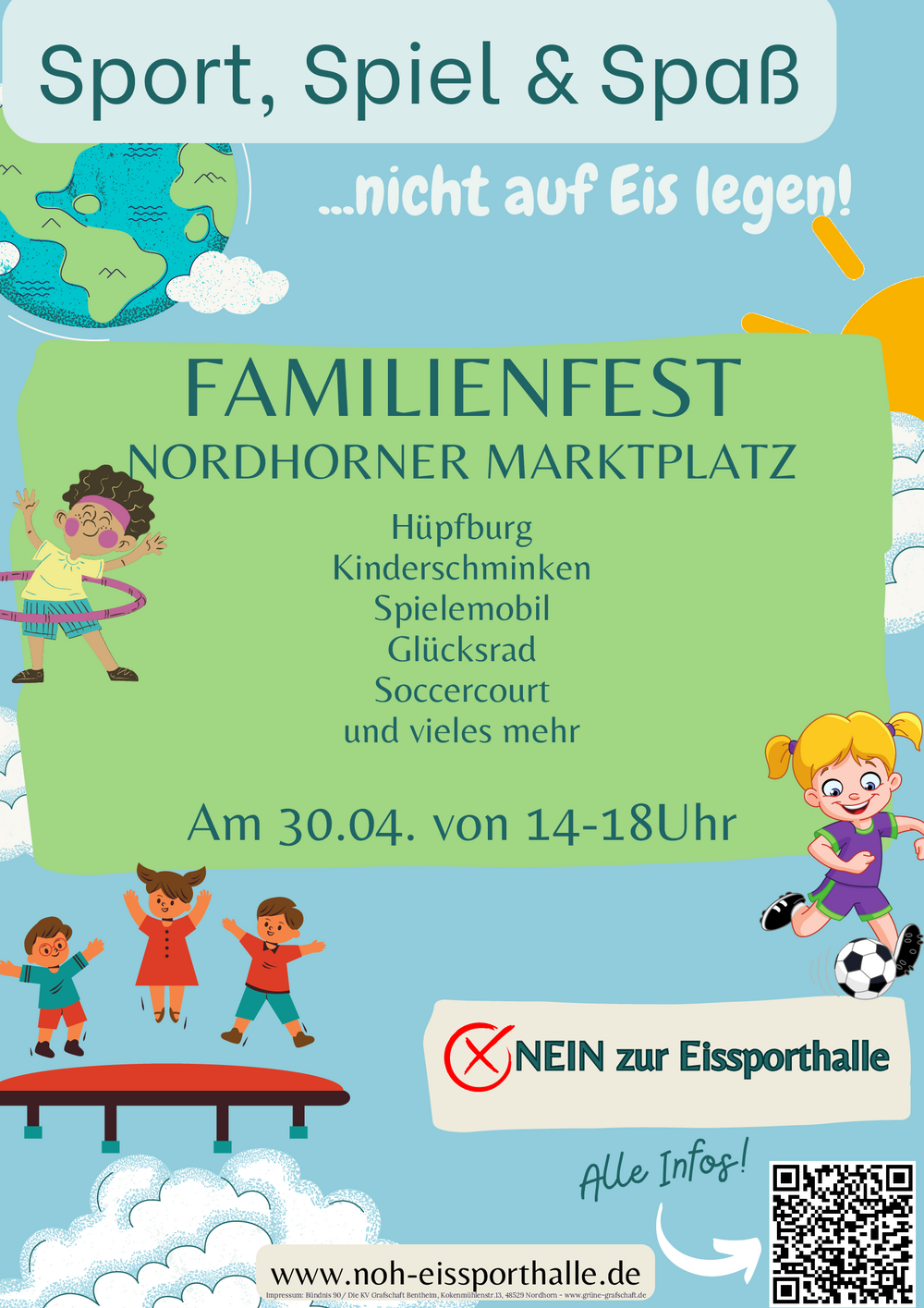 Nordhorn. Der Kreisverband von B90/DIE GRÜNEN lädt am Sonntag, 30. April, zum großen Familienfest auf dem Nordhorner Marktplatz ein. Von 14.00 bis 18.00 Uhr stehen vor allem die Kinder und Jugendlichen im Mittelpunkt. Mit Hüpfburg, Kinderschminken und einem großen Soccercourt wird viel geboten. Auch das Spielemobil des Kinderschutzbundes ist vor Ort. Am Glücksrad gibt es kleine Preise zu gewinnen. Zudem können sich die Besucher über den zweiten Bürgerentscheid zur Eissporthalle am 7. Mai informieren.