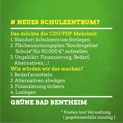 Nachdem die CDU/FDP Mehrheit sich einseitig auf ein neues Schulzentrum zwischen den Ortsteilen festgelegt hat, sollen sofort 80.000 € für die Flächennutzungsplanänderung ausgegeben werden. Dass diese Ausgaben möglicherweise unnötig sind, weil der Standort am Ende nicht sinnvoll / nicht möglich / nicht bezahlbar ist, scheint aktuell nicht zu interessieren. Fragen nach dem tatsächlichen Bedarf, möglichen Alternativen und einer gesicherten Finanzierung sollen erst im Nachgang beantwortet werden. Wir meinen jedoch, es hat sich immer noch bewährt, den ersten Schritt vor dem zweiten zu machen.