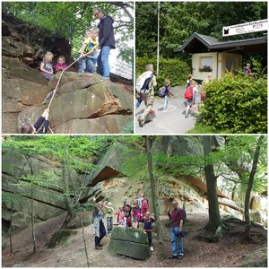 Im Rahmen der Bad Bentheimer Ferienpassaktionen trafen sich am 28.07.17 bei perfektem Wanderwetter 10 Kinder zu einer „Sandsteinralley“, organisiert vom GRÜNEN Ortsverband. Friedhild Füser, Günter Heetderks und Martin Lauffer führten die Kinder in den Bad Bentheimer Osten, um mit ihnen von der Jugendherberge über Schlüters Kuhle zur Freilichtbühne und weiter in den Bentheimer Wald mit seinen interessanten Klippenformationen und abenteuerlichen Wegen zu wandern. Es wurden Informationen über den Sandsteinabbau in früheren Zeiten gesammelt, spannende Geheimwege und Gewässer erkundet, Felsen erklettert und die Freilichtbühne von „innen“ besichtigt. Nebenbei wurden Müllsünden entdeckt (und so gut es ging beseitigt), es wurde über Märchenstücke gesprochen, Beeren- und Baumarten bestimmt und natürlich gepicknickt. Für die Kinder gab es zum Abschluss einen Bentheimer Sandsteinwürfel mit Burgmotiv, gestaltet vom Bad Bentheimer Künstler Manfred Flucht. „Insgesamt ein kurzweiliger toller Nachmittag mit Abenteuer und Spiel in wunderbarer heimischer Umgebung - auch für uns!“, resümieren die Veranstalter.
