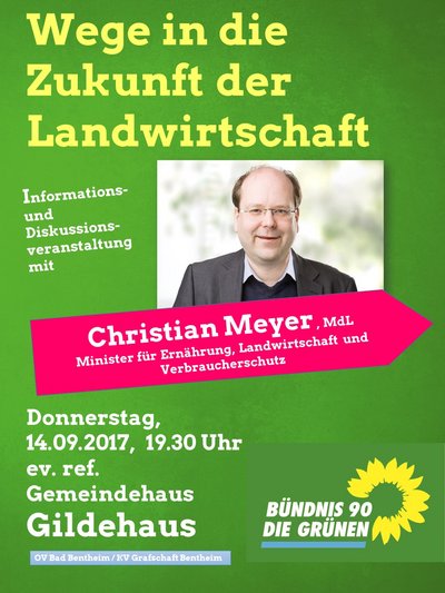 Für Donnerstag, den 14. September, lädt der Ortsverband Bündnis 90/DIE GRÜNEN Bad Bentheim in Zusammenarbeit mit dem GRÜNEN Kreisverband Grafschaft Bentheim alle Interessierten herzlich nach Bad Bentheim/Gildehaus ein. Die öffentliche Informations- und Diskussionsveranstaltung mit dem Titel „Wege in die Zukunft der Landwirtschaft“ wird um 19:30 Uhr im ev. ref. Gemeindehaus in Gildehaus, Dorfstr. 20, starten. Nicht erst jüngst müssen sich viele Landwirtinnen und Landwirte Sorgen um ihre Existenz machen. Bundesweit geben viele Höfe auf, weil unter dem Druck einer Billigspirale nicht genug Geld für Ihre Erzeugnisse erzielt wird. Damit einher gehen Tierleid, Umweltverschmutzung und eine zunehmende Entfremdung der Konsumentinnen und Konsumenten zur Herkunft ihres täglichen Brotes. Hier steuert Christian Meyer seit 2013 als niedersächsischer Minister für Ernährung, Landwirtschaft und Verbraucherschutz mit einer sanften Agrarwende gegen. Am 14. September wird Christian Meyer in Gildehaus einen Vortrag über seine Bemühungen für gesundes Essen, Tierwohl und eine für Erzeugerinnnen und Erzeuger gewinnbringende Landwirtschaft im Einklang mit der Natur halten. Hierbei wird er auch auf die Themen Rückgang der Artenvielfalt und den Aktionsplan Ökolandbau eingehen. „Die Grünen laden alle Landwirtinnen und Landwirte und alle interessierten Bürgerinnen und Bürger herzlich ein, sich in einer anschließenden Diskussion aktiv zum Thema einzubringen!“, so die Vorsitzende der GRÜNEN in Bad Bentheim, Friedhild Füser und der Vorsitzende des Grafschafter GRÜNEN Kreisverbandes, Reinhard Prüllage.