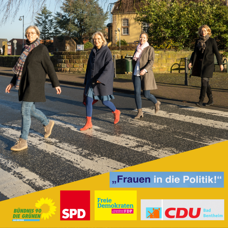 Wir, Friedhild Füser (Bündnis 90/DIE GRÜNEN), Dr. Carin Stader-Deters (SPD),  Katharina Pletz (FDP) und Dr. Susanne Veenker (CDU) rufen parteiübergreifend zu mehr weiblichem Engagement in der örtlichen Politik auf.