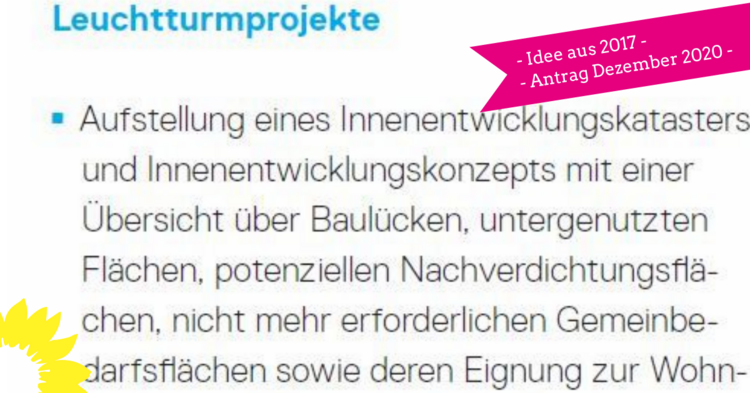 „Aufstellung eines Innenentwicklungskatasters und Innenentwicklungskonzepts mit einer Übersicht über Baulücken, untergenutzten Flächen, potenziellen Nachverdichtungsflächen, nicht mehr erforderlichen Gemeinbedarfsflächen sowie deren Eignung zur Wohnnutzung (Zielgruppen), Darstellung von Entwicklungspotenzialen und Hemmnissen”
