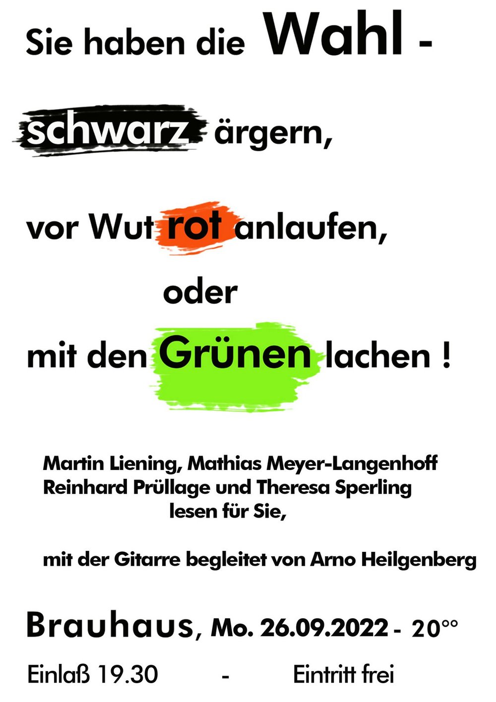 Am 26. September ab 19.30 Uhr laden wir zu einer satirischen Lesung mit Livemusik ins Nordhorner Brauhaus. Unter dem Motto „Sie können sich schwarz ärgern, vor Wut rot anlaufen oder mit den Grünen lachen“ lesen unsere Landtagskandidatin Theresa Sperling, Mathias Meyer-Langenhoff, Martin Liening, Reinhard Prüllage eigene sowie satirisch – politische Texte u.a. von Tucholsky, Gernhardt und Axel Hacke. Der Eintritt ist frei.