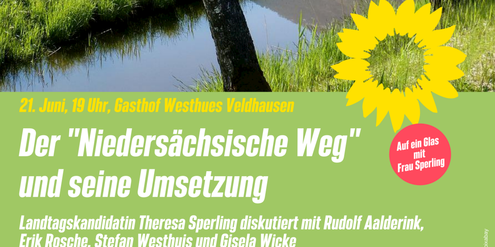 Die Landtagskandidatin der Grünen, Theresa Sperling, diskutiert in ihrer Reihe „Auf ein Glas mit Frau Sperling“ am 21. Juni, ab 19 Uhr, im Gasthof Westhues (Veldhausen) mit ihren Gästen über die Umsetzung des „Niedersächsischen Weges“. Welche Erfahrungen liegen nach rund eineinhalb Jahren vor? Welche Erfolge und Hindernisse sehen Akteure und Beobachterinnen? Müssen einzelne Maßnahmen noch einmal auf den Prüfstand? Diesen und weiteren Fragen stellen sich: