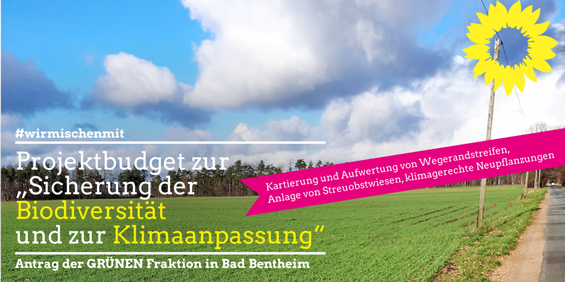 Mit diesem Budget sollen ökologische Maßnahmen zur Anpassung an den Klimawandel und zur Verbesserung und zum Erhalt der Biodiversität finanziert werden. Verschiedenste Maßnahmen sind denkbar und müssen im Ausschuss für Bauen, Umwelt und Energie vorbesprochen werden: z.B. Blühwiesen, Kartierung und Aufwertung von Wegerandstreifen, Pflanzungen von klimaangepassten Bäumen, Schaffung von Streuobstwiesen.