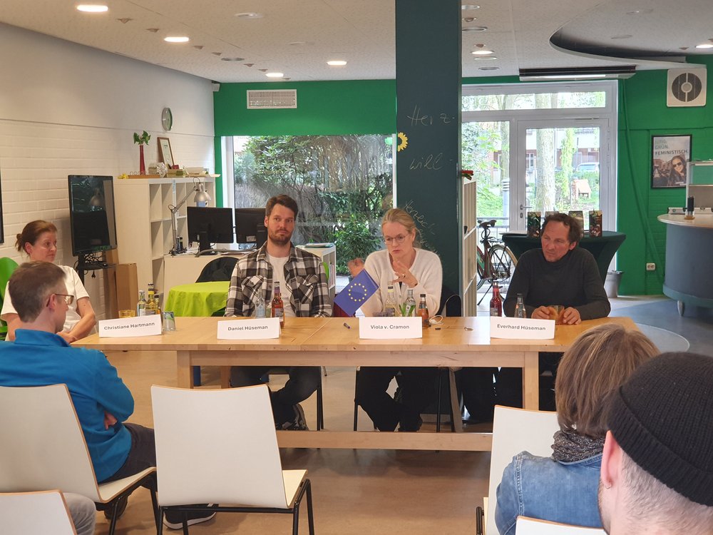 Vergangene Woche fand auf Einladung des Kreisverbandes BÜNDNIS 90/DIE GRÜNEN ein intensiver Fachdiskurs zu den aktuellen Herausforderungen der gemeinsamen europäischen Agrarpolitik (GAP-Regeln) statt. Zusammen mit Daniel Hüseman und Everhard Hüseman sowie den interessierten Bäuerinnen und Bauern diskutierte die Agraringenieurin und Europaabgeordnete Viola von Cramon und sprach sich aus Gründen des Natur- und Umweltschutzes sowie der Arterhaltung für eine Extensivierung der Landwirtschaft aus. Während über das Ziel Einigkeit bestand, wurden in der Diskussion die Tücken der Details beleuchtet: Wettbewerbsdruck, Übermacht des Einzelhandels, Flächenkonkurrenz, Importe mit niedrigen Standards, Erhalt der Trinkwasswerqualität und europäische Bürokratie.