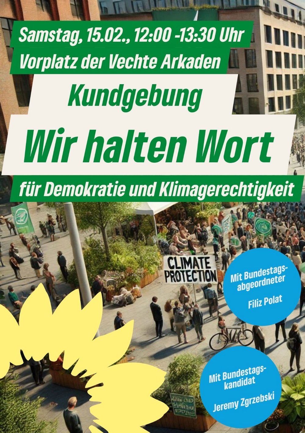 am Samstag, den 15.02., findet unsere Kundgebung „Wir halten Wort – für Demokratie und Klimagerechtigkeit“ auf dem Platz vor den Vechte-Arkaden statt. Mit dabei sind: