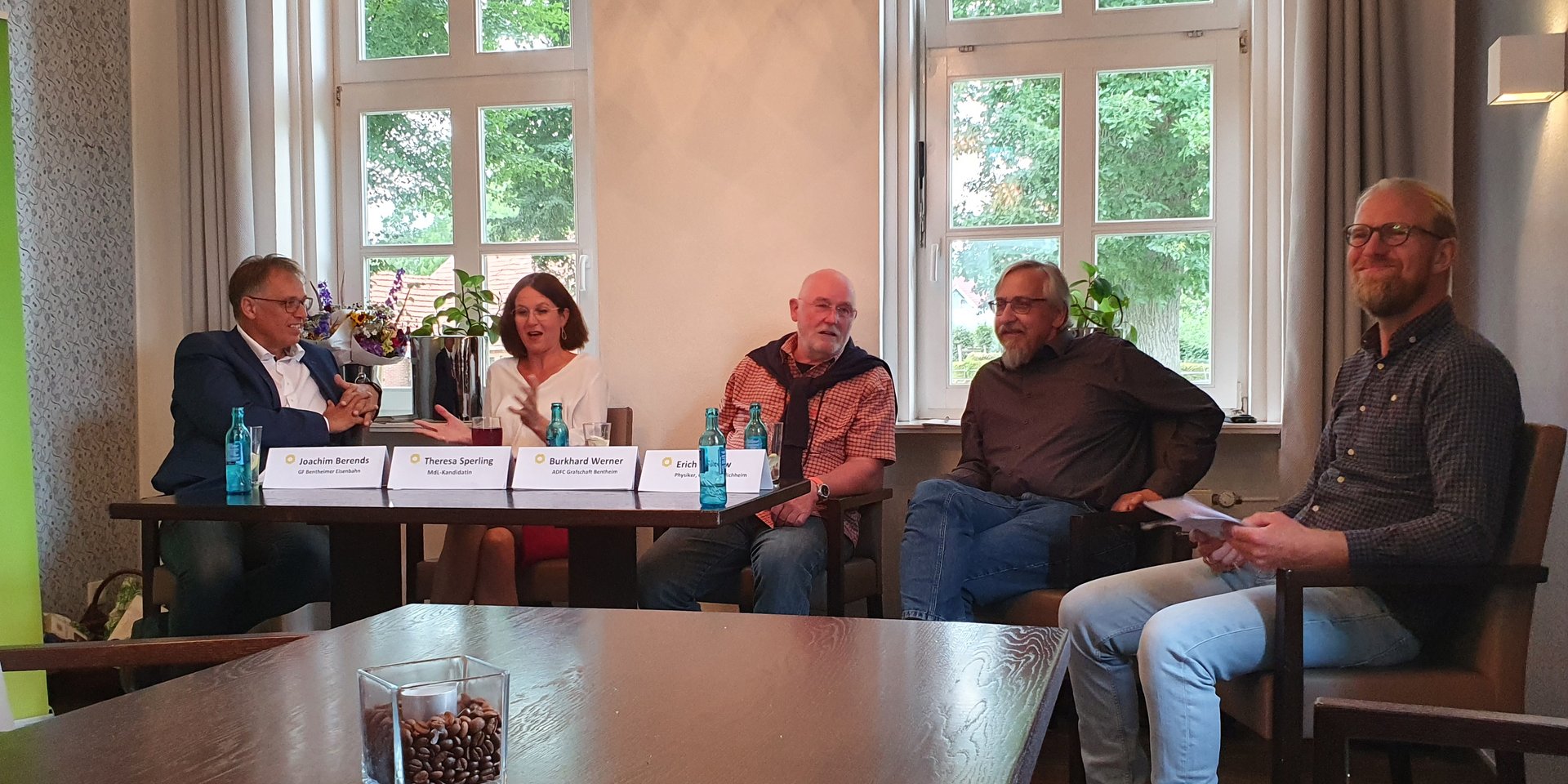 Zu diesem Thema lud die Grüne Landtagskandidatin Theresa Sperling am 7.7.2022 in den Hof Veldink in Emlichheim ein. Das gut besuchte Podiumsgespräch mit geladenen Experten wurde von Holger Gosink moderiert.